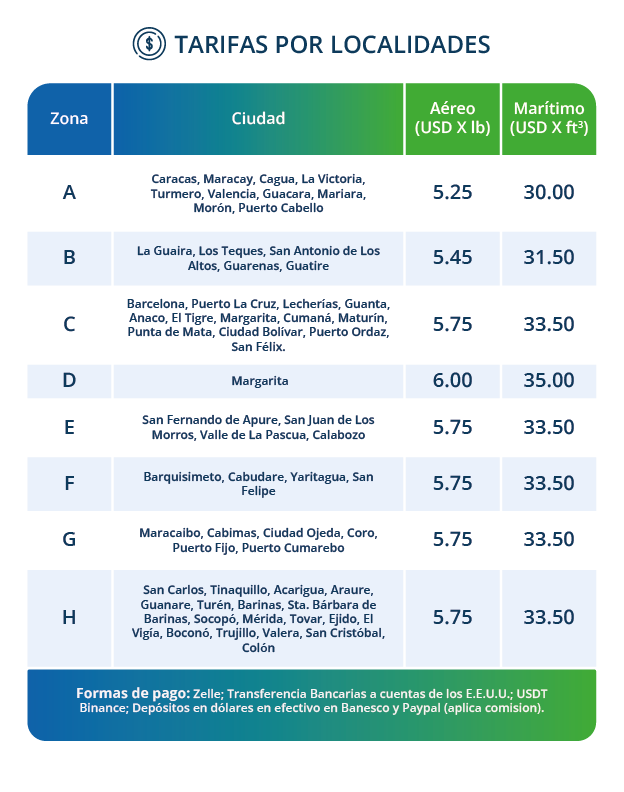La tarifa vigente es de USD 30,00 por pie cúbico para envíos a Caracas, Maracay y Valencia. Para otras ciudades de Venezuela aplicará el anexo de tarifas por localidad. Cargas sujetas a restricciones especiales requerirán cotización y aprobación previa de 1012 COURIER BOX.